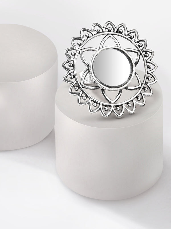 Fida Ethnic Set Of 3 Oxidised Silver Adjustable Statement Ring Set For Women